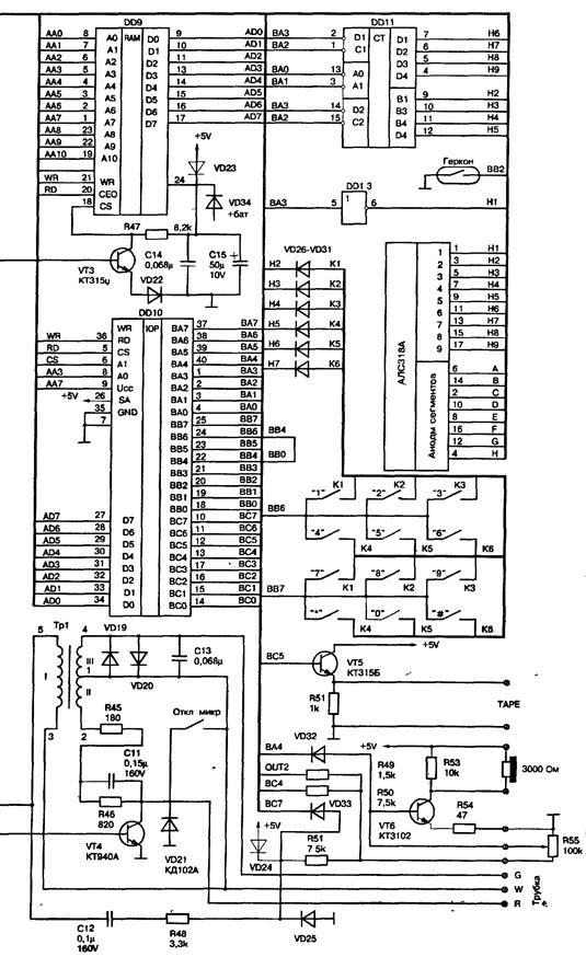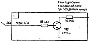 Узел реализован на элементах: R8,R9,VT2, где R8 - ограничитель тока базы VT2 (1-1,6КОм), VT2 - ключевой элемент (осуществляет подключение к телефонной линии нагрузки R9), обеспечивающий необходимый для реализации алгоритма определения номера потенциал линии VT2 - транзистор КТ940А или любой с Uкэ -150V;