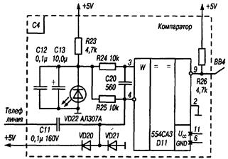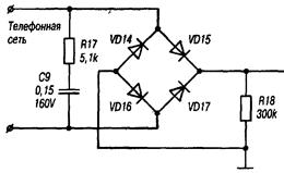 Предназначен для создания необходимой нагрузки для телефонной линии (R17,C9). Это позволяет несколько снизить высокочастотный шум в линии и обеспечивает универсальность подключения (VD14-VD17) к клеммам, независимо от полярности.