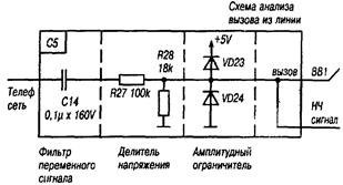 Вызов из линии - поступление от АТС прерывистого сигнала амплитудой 50-110V с частотой 25Hz. Исходя из этого и рассчитаны номиналы элементов этого узла. При отсутствии сигнала вызова на входе BB1 порта ввода/вывода D6 - лог. «0». При поступлении вызова из телефонной сети ток протекает: C14-R27-VD23-Ucc Конденсатор С14 пропускает сигнал вызова без искажений, далее делитель R27, R28, который понижает мощность сигнала. VD23 и VD24 - представляет собой амплитудный ограничитель сигнала, который обеспечивает размах импульсов вызова от АТС в пределах 0,5 -5,5V. Этот преобразованный сигнал и подается на BB1.