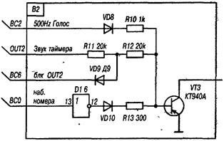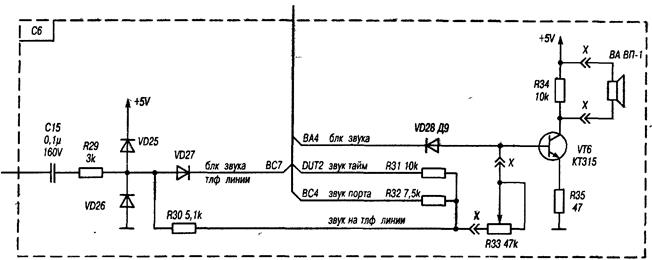 Сигналы, от этих источников проходя через ограничительные сопротивления R30-R32, складываются в один сигнал, который подается на регулятор громкости на переменном резисторе R33. Далее сигнал поступает на усилитель, выполненный на транзисторе VT6. Здесь необходимо отметить роль диода VD28. Он реализует функцию программной блокировки звука. При подаче на выход порта ВА4 уровня лог. 1 ток базы транзистора VT6 шунтируется черезVD28, при этом сигнал на усилитель не подается и звук не формируется.