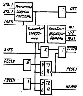Выход генератора опорной частоты выведен на внешний вывод OSC и соединен внутри микросхемы со счетчиком-делителем, входящим в состав .тактового генератора. Тактовый генератор состоит из счетчика-делителя на 9, логических дешифраторов, формирующих требуемые тактовые импульсы, выходных формирователей и вспомогательных логических схем и триггеров для генерации выходных сигналов: Ф1.Ф2.Ф2Т, STSTB, Тактовые импульсы Ф1 и Ф2 управляют МОП-входами микропроцессора КР580ВМ80А. Тактовый импульо Ф2Т используется для управления ТТЛ-входами в режиме прямого обращения к памяти.