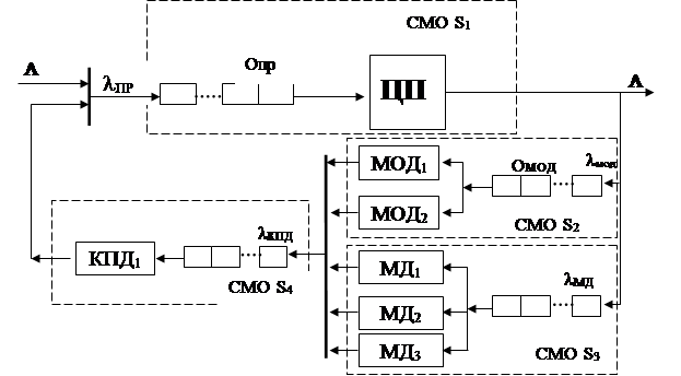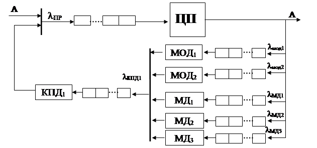 Для этого необходимо представить совокупность однотипных накопителей системы множеством одноканальных СМО с различной интенсивностью заявок. Среднее время обслуживания в СМО, представляющих накопители одного типа, остается одинаковым и равным соответственно uмд и uмод . Учет способа подключения накопителей к каналам приводит, с одной стороны, к различию в интенсивностях входящего потока заявок в СМО, представляющих в модели каналы передачи данных ,и , с другой стороны, к различию в среднем времени обслуживания заявок в этих СМО, в связи с различием в скоростях передачи данных через канал при обмене файлами.