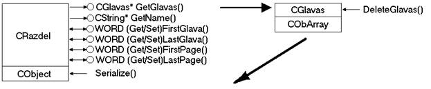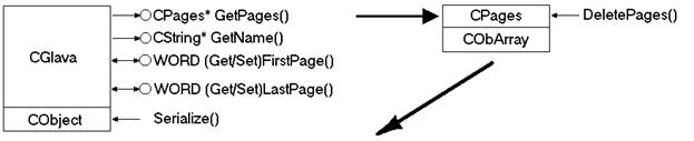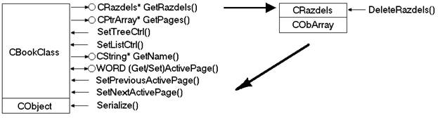 Классы CRazdels, CGlavas и CPages унаследованы от класса CObArray. Поэтому для объектов этих классов можно вызывать все члены-функции, присущие классу массива объектов.