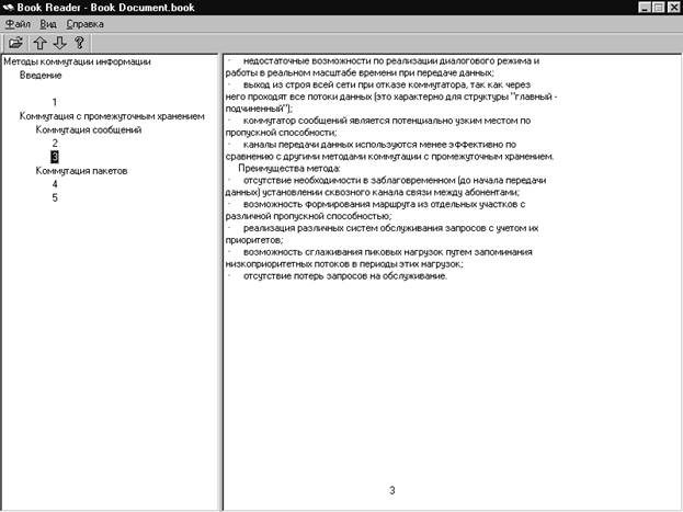 Здесь подробно остановимся на механизме «перелистывания» страниц, т.е. на переходе к предыдущей и последующей страницам. При работе с определенными элементами меню, кнопками панели инструментов или при нажатии специальных виртуальных клавиш в программе осуществляется «перелистывание» одной страницы вперед или назад. При этом управление передается членам-функциям класса документа OnPagedown() и OnPageup(). Эти функции вызывают члены-функции класса книги SetNextActivePage() и SetPreviousActivePage(), которые после обновления номера активной страницы вызывают закрытую член-функцию класса книги RenewCtrls(). Эта функция вызывает глобальные функции RenewTree() и RenewList(), передавая им в качестве аргументов указатели на элементы управления, отвечающие за отображение книги на экране, и указатель на объект книги. Данные глобальные функции, получив доступ к активной странице через указатель на объект книги, обновляют отображения оглавления и страницы в соответствии с номером активной страницы.