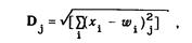 2. Определяются расстояния D j (в n-мерном пространстве) между Х и весовыми векторами wj каждого нейрона. В эвклидовом пространстве это расстояние вычисляется по следующей формуле