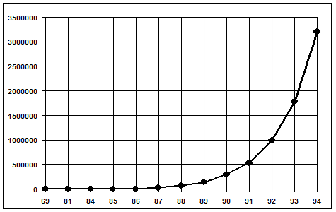 Спустя некоторое время TCP/IP был адаптирован в обычный, то есть в общедоступный стандарт, и термин Internet вошел во всеобщее употребление. В 1983 году из ARPANET выделилась MILNET, которая стала относиться к Defence Data Network (DDN) министерства обороны США. Термин Internet стал использоваться для обозначения единой сети: MILNET плюс ARPANET. И хотя в 1991 году ARPANET прекратила свое существование, сеть Internet существует, ее размеры намного превышают первоначальные, так как она объединила множество сетей во всем мире. Рисунок 1 иллюстрирует рост числа хостов, подключенных к сети Internet с 4 компьютеров в 1969 году до 3,2 миллионов в 1994. Хостом в сети Internet называются компьютеры, работающие в многозадачной операционной системе (Unix, VMS), поддерживающие протоколы TCP\IP и предоставляющие пользователям какие-либо сетевые услуги.