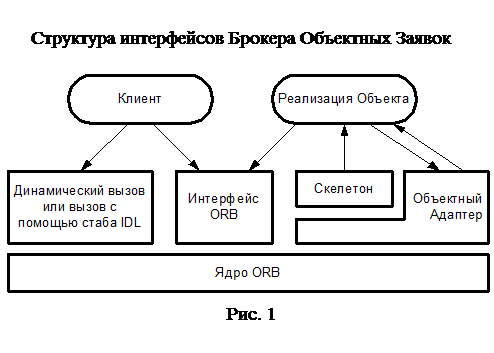 Брокер Объектных Заявок (Object Request Broker – ORB) - это промежуточное ПО, которое устанавливает клиент-серверные отношения между объектами в распределенной компьютерной среде [1]. ORB обеспечивает механизмы, позволяющие объектам посылать или принимать заявки, отвечать на них и получать результаты, не заботясь о положении других объектов в распределенной среде и способе их реализации. ORB отвечает за поиск реализации объекта-сервера для выполнения заявки, подготовку реализации этого объекта к приему заявки и за передачу данных, являющихся результатом выполнения заявки [8]. Брокер представляет собой механизм, позволяющий объектам выдавать заявки и получать ответы прозрачным образом. Благодаря этому обеспечивается интероперабельность между приложениями на различных аппаратных платформах в неоднородных распределенных средах. Необходимо подчеркнуть, что речь идет здесь о технической интероперабельности в том смысле, как это понятие интерпретируется в [3].
