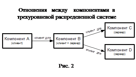 В трехуровневой архитектуре понятие клиента и сервера весьма условно. Компонент распределенной системы может выступать одновременно в роли клиента для другого компонента и быть сервером для других компонентов системы (рис. 2).