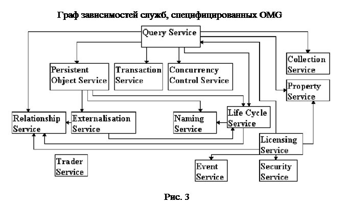 Известно, что службы OMG не являются независимыми друг от друга. Часть из них может быть создана на базе других служб. Согласно рекомендациям OMG, существует представленный на рис. 3 граф зависимостей одной службы от другой [11].