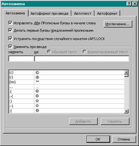 У автозамены есть несколько режимов, которые можно оставить или отключить, например, можно задать исправление двух прописных букв в начале слова. Выбрать команду Сервис , Автозамена – откроется диалоговое окно Автозамена . Если нужно отключить этот режим, сбросить флажок Заменять при вводе . Кнопка Исключения предлагает добавить те сокращения, которыми приходится пользоваться постоянно, чтобы в режиме автозамены следующее после них слово не начиналось автоматически с заглавной буквы. Можно также указать слова, которые требуют наличия двух заглавных букв в начале, чтобы и они не исправлялись автоматически.
