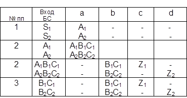 Пусть задана СРВ e1 , e2 , ..., em и для каждого РВ выполнено независимое построение СПп . Здесь S1 , S2 , ..., Sm начальные и Z1 , Z2 , ..., Zm заключительные состояния соответствующих СПп . Введем следующую проверочную таблицу (ПТ), на основе которой будем одновременно строить функцию разбора для всех РВ. ПТ содержит m+1 столбец, где 1,2,...,m столбцы, соответствуют буквам входного алфавита X, а 0-столбец представляет БС, именующие строки. Множество строк ПТ разбито на группы, каждая из которых может содержать до m строк по числу РВ, и представляет БС для всех РВ, полученных на некотором шаге построения функции разбора. В клетку пересечения строки и столбца записывается вычисленное значение функции разбора для данного БС и входной буквы.