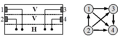 В многослойном канале возможны более сложные вертикальные ограничения. Если контакты расположены один над другим в соседних вертикальных слоях, что может иметь место в VVH канале, то порядок соответствующих им горизонтальных сегментов представляется в графе дополнительными ребрами так, как это показано на рисунке 1.