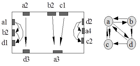 Если в канале существуют контакты, расположенные на боковых сторонах, то порядок их расположения также отражается в графе дополнительными ребрами. На рисунке 2 приведен пример канала, содержащего четыре цепи a, b, c, d с контактами на боковых сторонах, и соответствующий граф вертикальных ограничений.