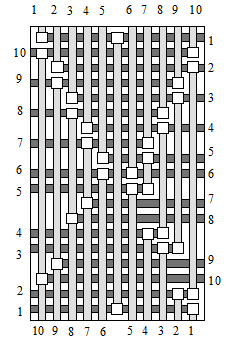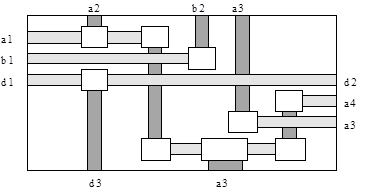 В общем случае итерации повторяются до тех пор, пока не будут удалены все циклы. Граф, рассмотренный в нашем примере, был приведен к ациклическому виду за один шаг. После этого была решена задача укладки горизонтальных сегментов в канале. Результат канальной трассировки показан на рисунке 4. Необходимо отметить, что это решение не удается получить ранее известными методами.