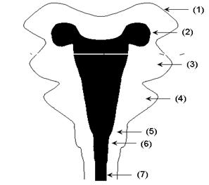 Пример. Передающий орган человека (эффектор) - голосовой аппарат (орган речи) - передает сообщения с помощью физических носителей - звуковых волн (15-20000 Гц). Воспринимающий орган (рецептор) - слуховые мембраны - воспринимают эти сигналы. Способ восприятия – слуховой. Время реакции на сообщение составляет порядка 200 мс. до ответа или реакции, так как раздражение от сигналов проводится по нервным путям к мозгу, где они обрабатываются и затем ответ проводится к эффектору. Обработка сенсорных сигналов и выработка ответа на них происходит на четырех различных уровнях нервной системы: на уровне коры головного мозга, на уровне таламуса, на уровне продолговатого мозга, на уровне спинного мозга. Структура организации и функции головного мозга человека приведены ниже на рис. 1. Примечания: 1 - кора головного мозга (управление высшей нервной деятельностью); 2 - борозды коры головного мозга (преобразование входной информации в импульсы, передаваемые двигательной системе); 3 - таламус (управление вводом-выводом данных в кору головного мозга); 4 - средний мозг (ввод-вывод данных от органов чувств и импульсы управления мышцами); 5 - мозжечок (центр выработки выходных импульсов для двигательной системы); 6 - продолговатый мозг и мозговой мост (центр управления вводом-выводом данных в каналы связи спинного ствола); 7 - спинной ствол (канал связи для передачи данных от органов чувств и выходных импульсов управления мышцами).