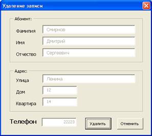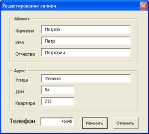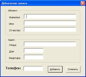 Внимание. В режиме добавления/корректировки записи обязательны для заполнения поля: Фамилия, Имя, Отчество, Улица, Дом, Телефон. Кроме того, в поле Телефон допускается ввод только числовых данных (не более 10 цифр).