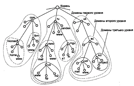 По аналогии с файловой системой в доменной системе имен различают краткие имена, относительные имена и полные доменные имена. Краткое имя — это имя конечного узла сети: хоста или порта маршрутизатора. Краткое имя — это лист дерева имен. Относительное имя — это составное имя, начинающееся с некоторого уровня иерархии, но не самого верхнего. Например, wwwl.zil — это относительное имя. Полное доменное имя (fully qualified domain name, FQDN) включает составляющие всех уровней иерархии, начиная от краткого имени и кончая корневой точкой: wwwl .zil.mmt.ru.Корневой домен управляется центральными органами Интернета: IANA и InterNIC. Домены верхнего уровня назначаются для каждой страны, а также на организационной основе. Имена этих доменов должны следовать международному стандарту ISO 3166. Для обозначения стран используются трехбуквенные и двухбуквенные аббревиатуры, например, ru (Россия), uk (Великобритания), fin (Финляндия), us (Соединенные Штаты), а для различных типов организаций — следующие обозначения: