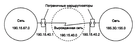 Понятно, что в любой автономной сети могут быть использованы произвольные IP-адреса, лишь бы они были синтаксически правильными и уникальными в пределах этой сети. Совпадение адресов в не связанных между собой сетях не вызовет никаких отрицательных последствий. Однако во всех сетях, входящих в единую составную сеть (например, Интернет), должны использоваться глобально уникальные IP-адреса, то есть адреса, однозначно определяющие сетевые интерфейсы в пределах всей составной сети. Уже сравнительно давно наблюдается дефицит IP-адресов. Очень трудно получить адрес класса В и практически невозможно стать обладателем адреса класса А. При этом надо отметить, что дефицит обусловлен не только ростом сетей, но и тем, что имеющееся адресное пространство используется нерационально. Очень часто владельцы сетей класса С расходуют лишь небольшую часть из имеющихся у них 254 адресов. Рассмотрим пример, когда две сети необходимо соединить глобальной связью. В таких случаях в качестве канала связи используют два маршрутизатора, соединенных по схеме «точка-точка» (рис. 4). Для вырожденной сети, образованной каналом, связывающим порты двух смежных маршрутизаторов, приходится выделять отдельный номер сети, хотя в этой сети имеются всего два узла.