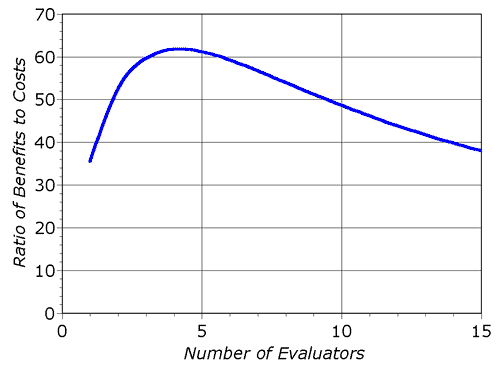 На рис.3 представлены различные соотношения отдачи от теста к его стоимости при различном количестве участников теста. Кривая показывает, что Оптимальное количество участников теста - 4 человека. Это подтверждает общие наблюдения, что эвристическая оценка лучше всего работает, когда в ней принимает участие от трех до пяти экспертов. В нашем примере, если эвристическая оценка обошлась бы в 6.400 долларов, а общая стоимость найденных проблем с юзабилити составила бы 395.000 долларов.