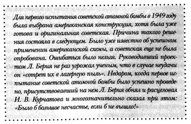 Конечно, огромную помощь в создании советской атомной бомбы сыграла наша разведка. Благодаря блестяще проведенной операции удалось получить подробные данные о принципах действия, конструкции и испытаниях американской атомной бомбы. Это значительно упростило задачу и ускорило завершение нашего атомного проекта. Во избежание утечки информации все полученные данные сообщались только одному И. В. Курчатову, который приезжал в Кремль и знакомился с ними только там. Другие участники атомного проекта не знали об этом. Это давало возможность избегать тупиковых путей, уже опробованных американскими учеными, и сразу вместо проведения многих лабораторных экспериментов организовывать промышленное производство, прежде всего расщепляющихся материалов (изотопа урана-235 и плутония — искусственного химического элемента) — «начинки» атомной бомбы. Ведь для их производства необходимо было создать целую новую отрасль промышленности — атомную. Нужно было построить целые комбинаты с ядерными реакторами и целый ряд производств сверхчистых материалов, например графита для реакторов.