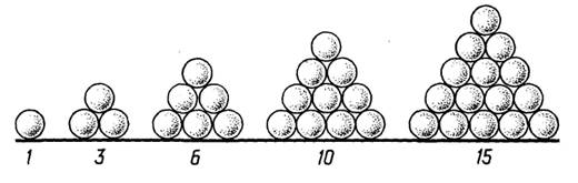 Вивчаючи натуральний ряд чисел, піфагорійці встановили таку властивість сум послідовних чисел: 1+2 = = 3, 1+2+<3 = 6, 1+2 + 3+4=10, 1 + 2 + + 3 + 4 + 5=15 і т. д. Числа 1, 3, 6, 10, 15... вони називали трикутними числами, бо якщо скласти фігуру з кружечків, кількість яких відповідає кожному з цих чисел, то вона матиме форму трикутника (дивись малюнок).