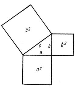 Прямокутний трикутник піфагорійці вважали найкращою і найдосконалішою фігурою. Одним із способів побудови такого трикутника був поділ правильного трикутника пополам. Прямокутні трикутники, довжини сторін яких — цілі числа, утворюють окремий клас, для якого справджується теорема, названа ім'ям Піфагора, хоч вона була відома задовго до нього вавілонянам. За теоремою Піфагора сума площ квадратів, побудованих на катетах прямокутного трикутника, дорівнює площі квадрата, побудованого на гіпотенузі (дивись малюнок).