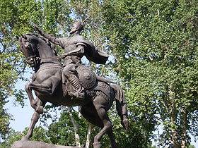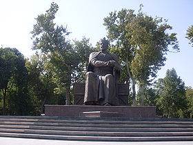 Памятник Тамерлану в Самарканде. Тимур представлен сидящем на скамье и опирающемся обеими руками на меч.