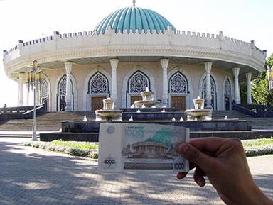 Музей Амира Тимура в Ташкенте и его изображение на купюре достоинством 1000 сум .