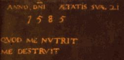 Кристофер Марло году. Но не в конце мая , когда в Стрэтфорде на Эйвоне родился «официальный Шекспир» , а примерно месяцем раньше . когда в одном из замков на берегу той же речки родился «Эйвонский лебедь» (именно так окрестил в 1623 году покойного «Шекспира» Бен Джонсон в предисловии к знаменитому Большому Фолио). И , видимо, именно тайна рождения может объяснить смысл загадочного девиза студента колледжа «Корпус Кристи» Кристофера Марло : «Qvodmenutritmedestrvit» Девиз на портрете ( «То , что меня кормит , меня убивает»). Этот девиз начертан на портрете, обнаруженном при реконструкции помещения колледжа «Корпус Кристи» уже в середине XXвека. Портрет написан по случаю совершеннолетия изображенного на нем мужчины ; идентификация произведена по изображенной там же дате : «1585 год от Рождества Христова Совершеннолетие 21 год» По сохранившимся спискам студентов установлено , что в 1585 году из всех студентов колледжа только Кристоферу Марло исполнился 21 год.