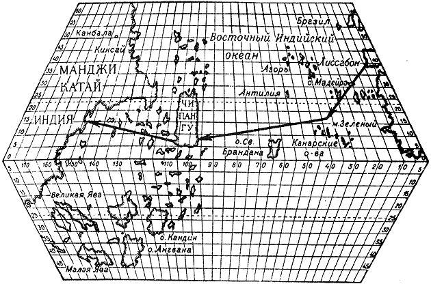 Карта Тосканелли с предполагаемым маршрутом Колумба