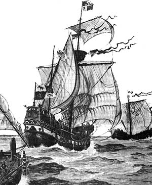 В порту Пилос были снаряжены три каравеллы. Флагманским судном была "Санта-Мария": длина наибольшая - 23,0 метров, ширина - 6,7 метров, осадка - 2,8 метров, водоизмещение - 237 тонн, экипаж - 90 человек. Капитаном корабля был Колумб, маэстре (то есть шкипером, он же судовладелец) - Хуан де ла Коса , пилотом (штурманом) - Пералонсо . Здесь хотелось бы отметить, что подлинных документов о "Санта-Марии", описания ее конструкции и исторически достоверных изображений не сохранилось, поэтому в разных источниках указываются различные размерения корабля. Достоверно известно только о ее вооружении.