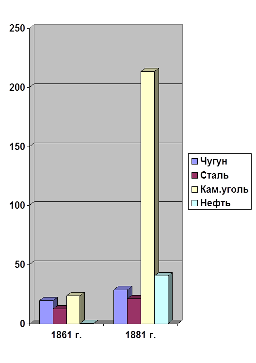 На базе донецкого угля и открытого в 80-х годах месторождения железной руды в Криворожье начинается стремительное развитие черной металлургии на юге России. Производство чугуна в 1890 г. было в 3 раза выше, чем в 1861 г. Удельный вес металлургии Юга в общей выплавке чугуна в России за это время увеличился с 4,5 до 28,5%.
