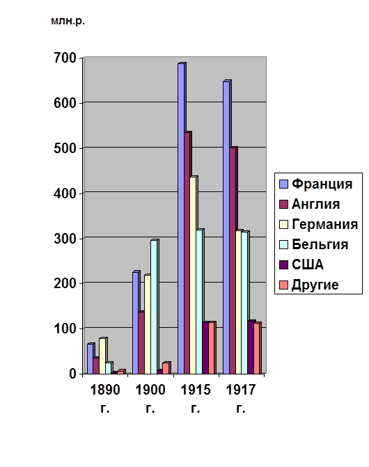 Приложение 4. Распределение по странам-кредиторам иностранной задолженности России к 1914 г. и за 1914-1917 гг. (Бовыкин В.И. Россия в мировой капиталистической системе. // Чтение по русской истории. Хрестоматия для старшеклассников. Тула: Пересвет, 1995).