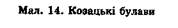 У козацькому війську відзнаки звалися клейнодами. Козацькі клейноди — булава, бунчук, печатка, прапори, бубни і труби (мал. 12, 13, 14). Булава та бунчук — відзнаки гетьманської влади. Бунчук — довга палиця (до 3 м) з металевим яблуком на кінці, з-під якого звисало кінське волосся. Печатка Запорізького війська була округлою, з гербом посередині, різних розмірів. Свої печатки мали військова канцелярія, кожний полк, інколи навіть сотня. У війську був один спільний прапор і були полкові та сотенні прапори.