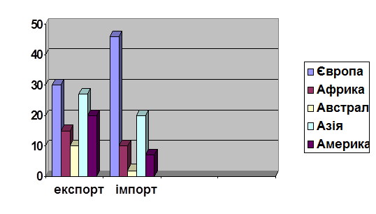 Значно активізували торгівельні зв'язки з нами США, Канада, Японія та інші неєвропейські економічно розвинуті країни (мал. 4.1). У групі країн, що розвиваються, найбільше значення для України має Індія. Українські підприємства брали участь в поставках у цю країну комплектного обладнання для будівництва металургійних, енергетичних та машинобудівних об'єктів. Окрім того, здійснювались поставки сучасного озброєння. Україна одержує з Індії бавовняні тканини, одяг, чай, каву, фрукти, соки.