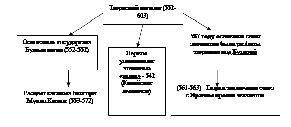 В V веке в степной полосе от северной Монголии до Восточной Европы расселялись тюрко-язычные племена. Первое упоминание этнонима "тюрк" встречается в китайских летописях в 542 году. Китайцы считали тюрков потомками Хунно. Расцвет каганата был при Мукан кагане 553-572. Основатель государства был Бумын каган 552-553. Тюркский каганат достиг политического господства в центральной Азии. В VI веке под власть тюркского каганата попали земли Казахстана. Стремясь овладеть богатствами оседлых племен, тюрки двинулись в среднею Азию. Здесь они встретились с эвталитами, владения, которых простирались от каспийского моря до северной Индии и восточного Туркестана. После завоевания средней Азии тюрки стали хозяевами торгового шелкового пути в страны среднеземнорья. Тюрки и находившиеся под их властью согдийцы были заинтересованы в торговых связях с Византией. Но этому препятствовал Иран, 568 году согдийский маниях (купец) возглавил посольство Тюркского каганата в Константинополь. Тюрки заключили торговое соглашение с Византией и военный договор против Ирана. В связи с этим Иран обязался выплачивать тюрком дань в 40 тыс. золотых ежегодно и не препятствовать торговле. Междоусобные войны при правлении Истима кагана и его сыне, а также социальные противоречия ослабели каганат и в 603 году из Тюркского каганата выделился Западно-тюркский.