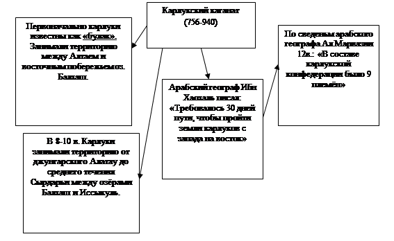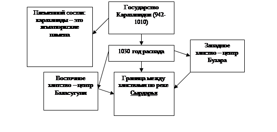 Территория: от Маверанахра на запад до Семиречья и Кашгара на востоке. Источники: Махмуд Кашгари "Диуани Лугат ат - Тюрк" - "словарь тюркских наречий". Юсуф Баласагуни "Кутатгу белиг" - "Знание приносящие счастья". Ахмет Яссауи - "Дидани хит-мат" - "книга мудрости". Родоначальником династии Караханидов был Сатук. Богра хан - 942 год он сверг правителя Баласагуне и объявил себя верховным каганом. Государство не было плаченым, оно делилось на уделы, правители уделов обладали большими правами, что даже чеканили свои монеты. В 960 году Богра хан Харн Мусса принял ислам в качестве государственной религии - распространение Ислама способствовало сложение письменности на основе арабской графики. В 1089 году Караханиды попали в вассальскую зависимость от сельджуков.1141 год разгром Караханидов в сельждукского войска, власть обоих перешла к каракитаем. В начале 13 века борьба с найманами и с хорезмейцами. Процесс нового этапа государственного развития прервало монгольское нашествие.