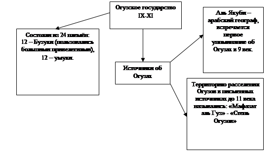 В середине 8 века в результате борьбы с карлуками за тюргешское наследие Огузы покинули Семиречье и Жетесу и переселились в средние течения Сырдарьи, позднее расселились от Сырдарьи до Волги. Политической консолидацией огузских племен способствовала борьба с печенегами. Огузы играли важную роль в военной и политической жизни Евразии. В 965 году в союзе с Киевской Русью они разгромили Хазарский каганат, а через 20 лет (985) волжскую Болгарию - это способствовало укреплению мощи Огузов. Верховный правитель Джабгу, заместитель Джабгу - Куль - Еркен, предводители войск Сюбаши. Власть верховных правителей передавалась по наследству.