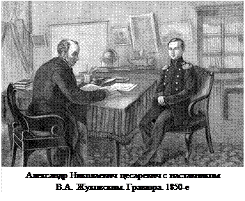 В шесть лет воспитание Александра было поручено человеку сугубо военному - капитану Мердеру. Это был боевой офицер, награжденный за храбрость, проявленную под Аустерлицем, участник всех битв кампании 1806 - 1807 годов. Современники единодушно отзывались о нем, как о человеке высоконравственном, добром, обладавшем ясным и любознательным умом и твердой волей. Вообще, выбор оказался удачным. Сделавшись императором, Николай тотчас озаботился общим образованием наследника и избрал ему в наставники Жуковского. Поэт отнесся к назначению с величайшей ответственностью. В течение полугода он составил специальный "План учения", рассчитанный на 12 лет и одобренный Николаем . Этот педагогический трактат представлял собой подробную программу нравственного воспитания и обучения