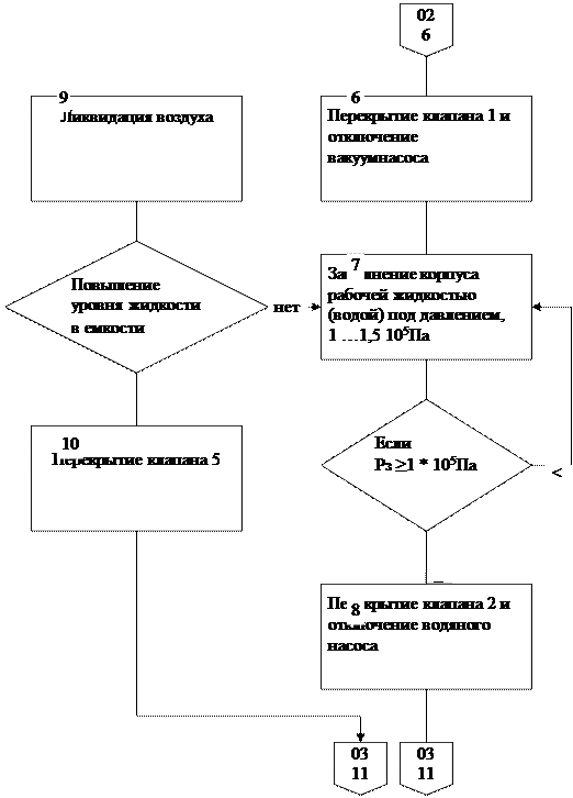 В подготовленную таким образом камеру подается жидкая рабочая среда за счет устройства 7, часть жидкости при этом перетекает в специальную емкость водного затвора, в которой уровень ее регистрируется блоком , который после достижения заданного уровня подает на Б.У. сигнал о прекращении подачи жидкой среды и включении в работу блока 9.
