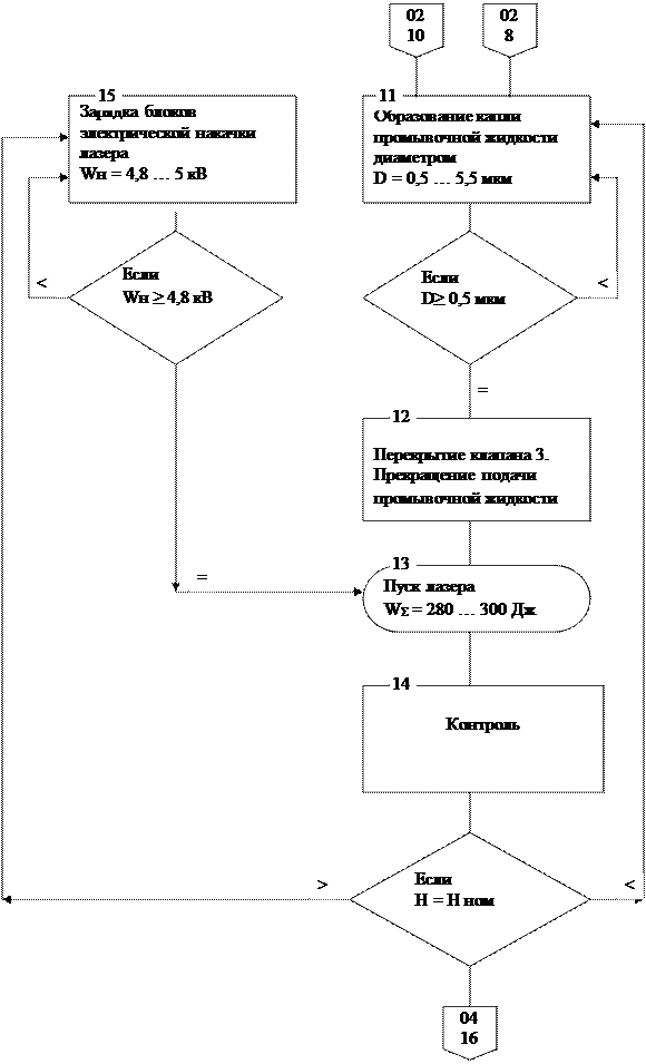Качество выполнения операции может регистрироваться с помощью датчиков встроенного контроля (блок 11), которые подают сигналы на Б.У. В случае невыполнения заданных требований Б.У. выдает команду на повторение операции, а при достижении требуемого качества – на блок 8, который сливает обработанную жидкую среду и катализатор, и приводит все элементы установки в исходное состояние.