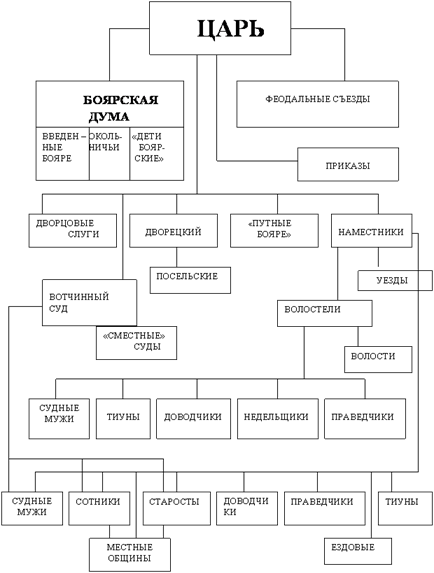 Боярская дума, постоянно действующий совет знати, сложилась при великом князе. Ее члены назначались великим царем на основе местнических правил. Боярская дума развивалась из совета при князе, включавшего наиболее крупных феодалов. В Думу входили потомки бывших удельных князей и наиболее родовитые и влиятельные бояре (20-30 человек) Самостоятельной роли боярская дума не играла, она всегда действовала вместе с царём, составляя совместно с государем единую верховную власть.