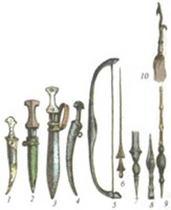 Рис. 2.2 Персидское оружие: 1—4 — кинжалы; 5—6 — лук и стрела; 7—10 — наконечники копий