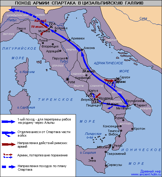 Но брожения в армии не изменили планы Спартака. Искусно маневрируя в Апеннинах, он нанес ряд поражений Лентулу, Геллию, Аррию, вырвался из окружения, которое подготовили римляне, и двинул на север.