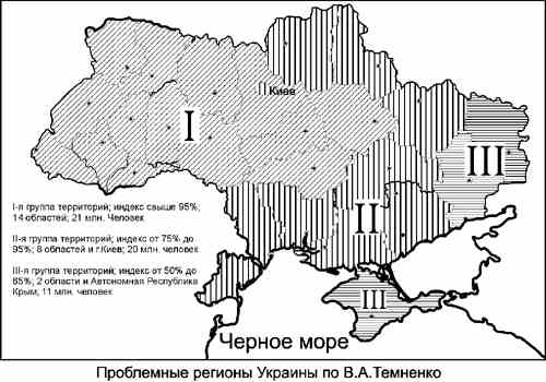 Иной принцип районирования Украины предлагает крымский социолог Валерий Темненко. В соответствии с процентом украинцев, считающих родным языком украинский, он выделяет три группы территорий: 1-я (14 областей, 21 млн. чел.) — с наиболее высоким уровнем распространения среди украинцев украинского языка (свыше 95%); 2-я (8 областей и город Киев, 20 млн. чел.) — со средним показателем языкового индекса (от 75% до 95%); 3-я (2 области и Автономная Республика Крым, 11 млн. чел.) — с наиболее низким индексом (от 50% до 65%). По мнению Темненко, «на уровне «корневой толщи» Украина является федеративной структурой с тремя четко обозначающимися федеративными составляющими».