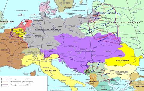 | 1914 | 4 августа немцы вторглись на территорию Бельгии. Продолжая наступление, немцы форсировали реку Марна и 5 сентября остановились вдоль линии Париж – Верден. В Верденском сражении участвовало 2 млн. чел., 5 германских и 6 млн. чел. Англо-французских солдат. Война имела оппозиционный характер. 4 августа Российская армия вторглась в приделы Германии. Немецкая армия терпит поражение. 23 августа войну начинает Япония. Образовались новые фронта в Закавказье и Месопотамии, на Синайском полуострове. | Война ведётся на 2 фронта и принимает позиционный характер (т.е. затяжной). |