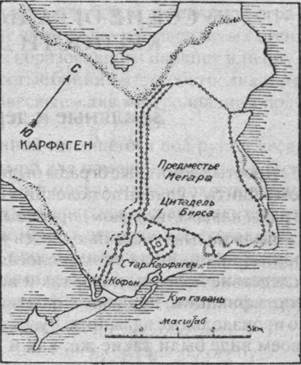 Одной из сильнейших крепостей древнего мира считалась крепость Карфагена. Карфаген состоял из предместья Мегара и старого города, отделявшегося поперечной стеной и включавшего в себя цитадель Кирсу и гавань: последняя в свою очередь разделялась на военную гавань Кофон и коммерческую. Военная гавань могла вмещать 220 больших судов, для которых имелись специальные сводчатые закрытия, посреди Кофона имелся остров, на котором Рис. 1. Крепость Карфагена