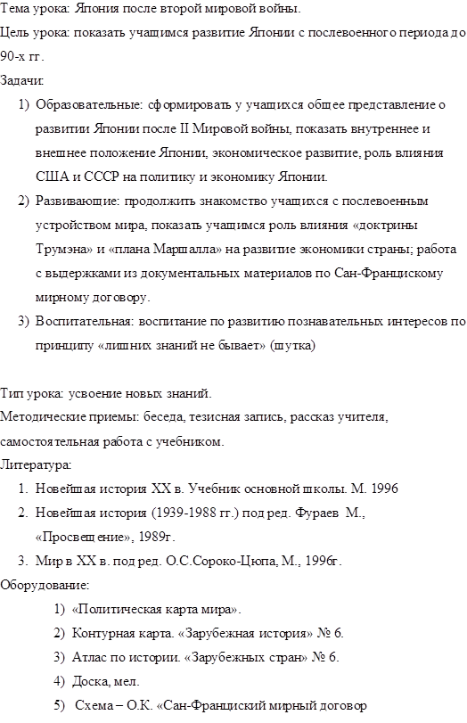 Последний раздел работы посвящен разработке школьного урока по истории "новейшего времени" - "Япония в 50 – 70 гг. ХХ в.".