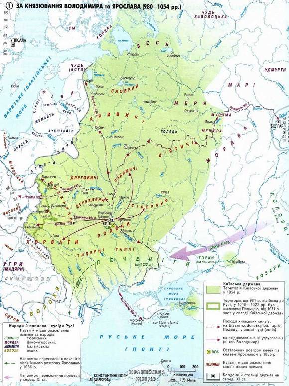Ярослав Мудрий[22] (1034- 1054 ). Дуже рано Ярослав розпочав політичну кар’єру. Період князювання Ярослава позначився піднесенням Давньоруської держави. Ярослав продовжував розширювати кордони. Завдяки його підтримці швидко зростала церква, заснувалися монастирі. Ярослав докладав багато зусиль для збереження територіальної цілісності та єдності Руської держави. Він почав будувати міста по Русі й остаточно здолав печенігів. За часів Ярослава Мудрого на Русі було засновано перші монастирі- Свю Юрія, Св. Ірини та Києво-Печерський монастир, які стали великими церковними і культурно-освітніми центрами. Одним із провідних напрямків політикі Ярослава було поширення книжності й освіти.