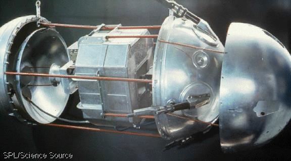 Создание мощной ракеты-носителя позволило нашей стране выйти на лидирующие позиции в исследовании космоса . 4 октября 1957г. Р-7 вывела на орбиту первый искусственный спутник земли Это был алюминиевый шар диаметром 58 см, и массой 83 кг, снабженный радиопередатчиком . Впервые созданный человеком аппарат достиг первой космической скорости . Это событие принято считать началом космической эры - эры практической космонавтики. Связь с первым спутником продолжалась 20 суток (на столько хватило заряда батарей) , после чего он еще около двух с половиной месяцев кружил над землей , пока не сгорел в плотных слоях атмосферы. В ходе этого эксперимента изучалась ионосфера земли и возможность установления связи с космическим аппаратом , а также (в ходе наблюдения за движением спутника) верхние слои атмосферы.